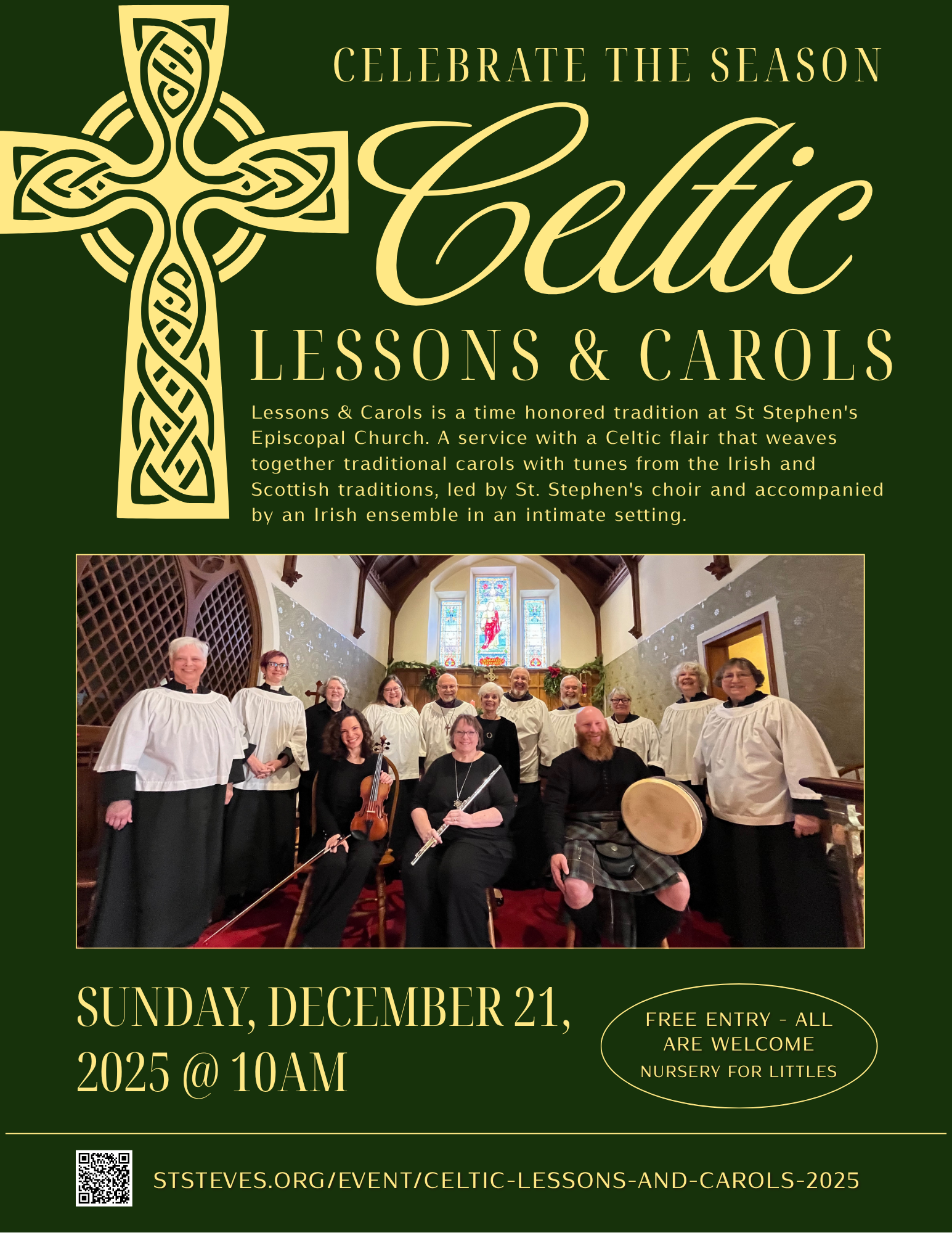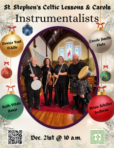 Lessons & Carols is a time-honored tradition at St Stephen’s Episcopal Church. This service will have a Celtic flair as it will weave together traditional carols along with tunes from the Irish and Scottish traditions, led by St. Stephen’s choir accompanied by an Irish ensemble.